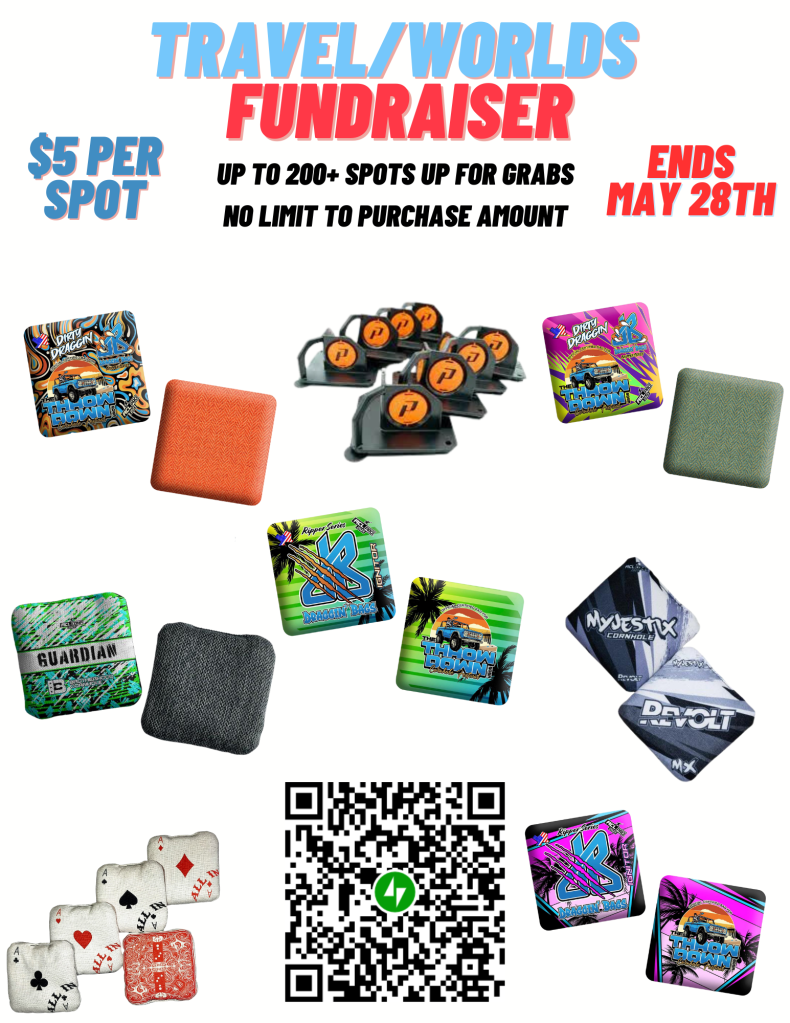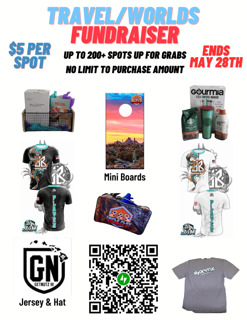 Welcome to our Players Travel/Worlds Expenses fundraising page for 2023. As the season closes in, we have many players that have National, Regional, Open, Arizona State Championships and World’s travel expenses coming up. In an effort to help these incredible players out, we have decided to begin our virtual fundraiser early this season. What is unique about this season is that we have partnered up with many of the players sponsors to make this possible. We are proud of the community support and the moving parts that it takes to have these players represent Triple Play Cornhole as they travel locally, nationally, and our future hope on the international scale. Thank you from all of sponsored players to those who have taken the time to share or participate in this fundraising event. We wish you all the best of luck!